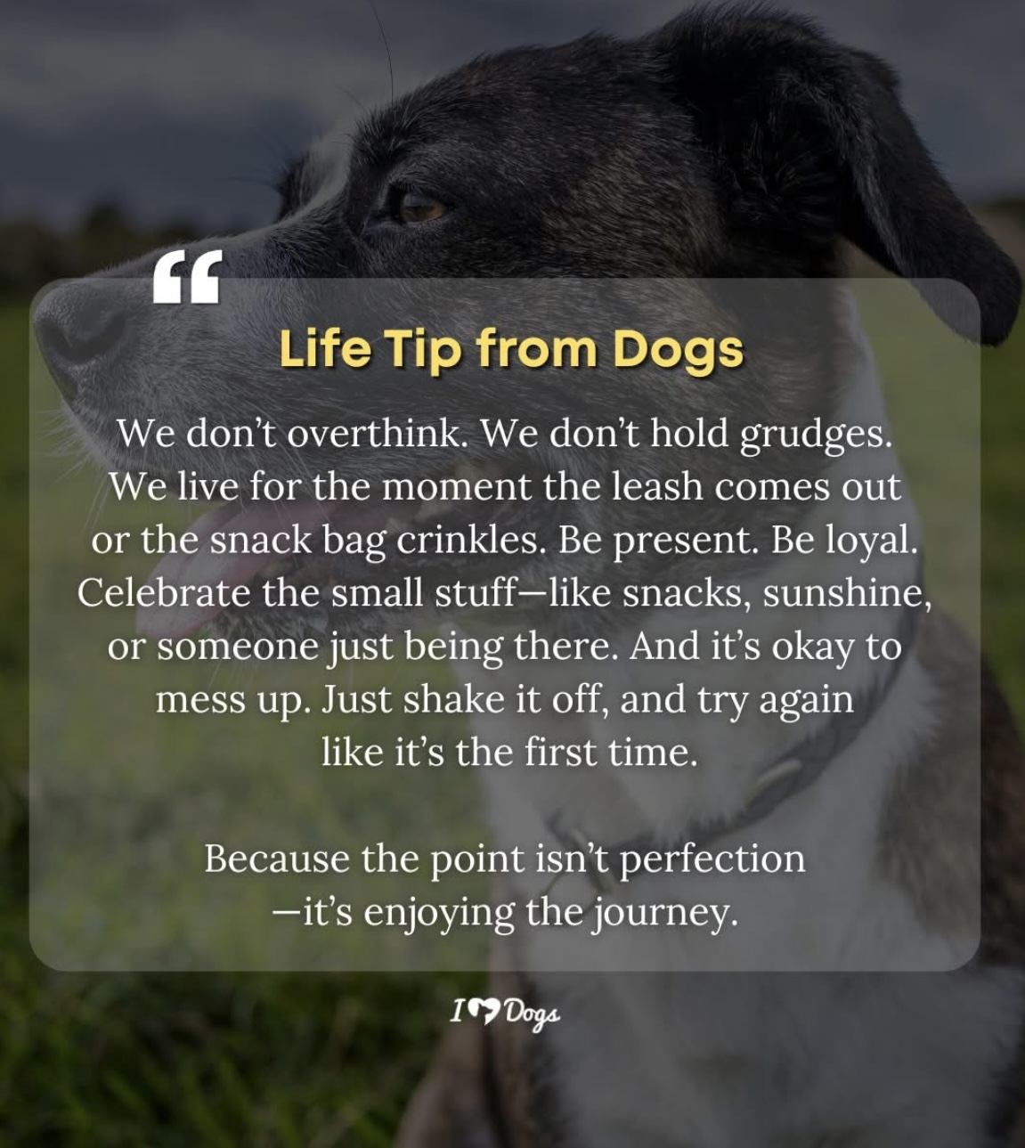 “We don’t overthink. We don’t hold grudges. We live for the moment the leash comes out or the snack bag crinkles. Be present. Be loyal. Celebrate the small stuff —- like snacks, sunshine, or someone just being there. And it’s okay to mess up. Just shake it off and try again like it’s the first time. Because the point isn’t perfection —- it’s enjoying the journey.”